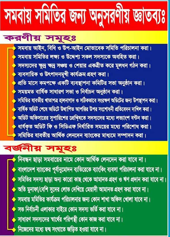 প্রতিটি সমবায় সমিতিকে সমবায় আইন ও বিধিমালা অনুসরন করে সমিতি পরিচালনা করতে হবে।